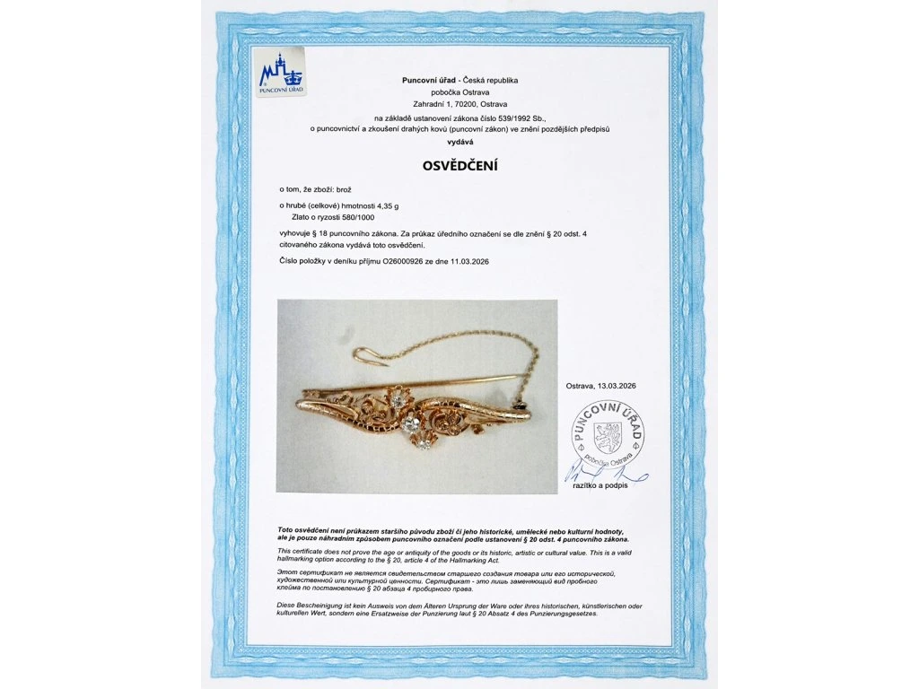 - osvědčení Puncovního úřadu České republiky
