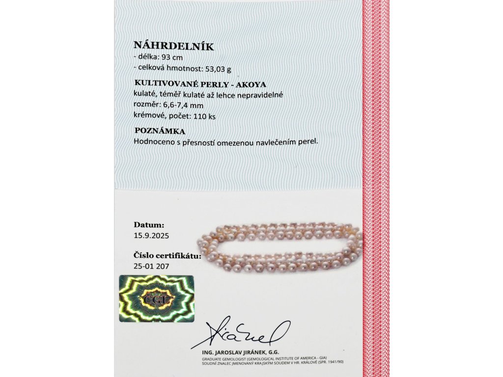 Materiál: perly AkoyaHmotnost: 53,03 gRozměry: délka 93 cm, průměr 6,6-7,4 mm
