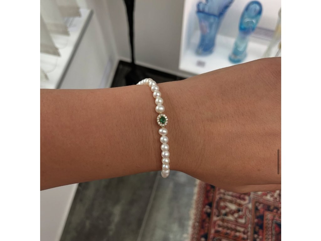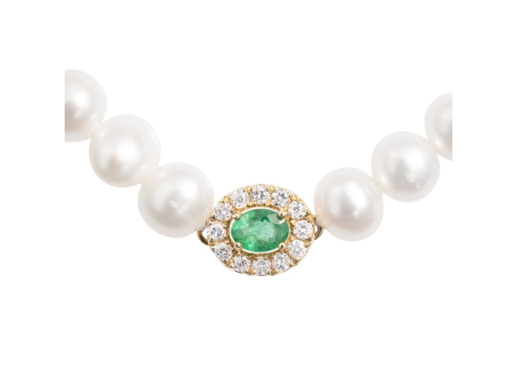 žluté zlato o ryzosti 585/1000váha 4,50 gmíry 0,8 x 0,6 cmdélka 17 cmprůměr perly 0,4 cmsmaragd 0,10 ctdiamanty 0,10 ct22 perelvýborný stavnová prácepuncováno platným puncem