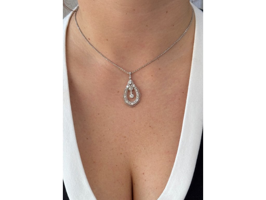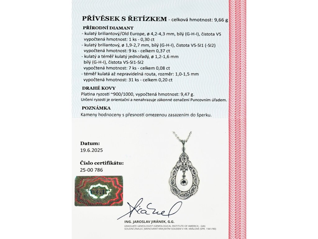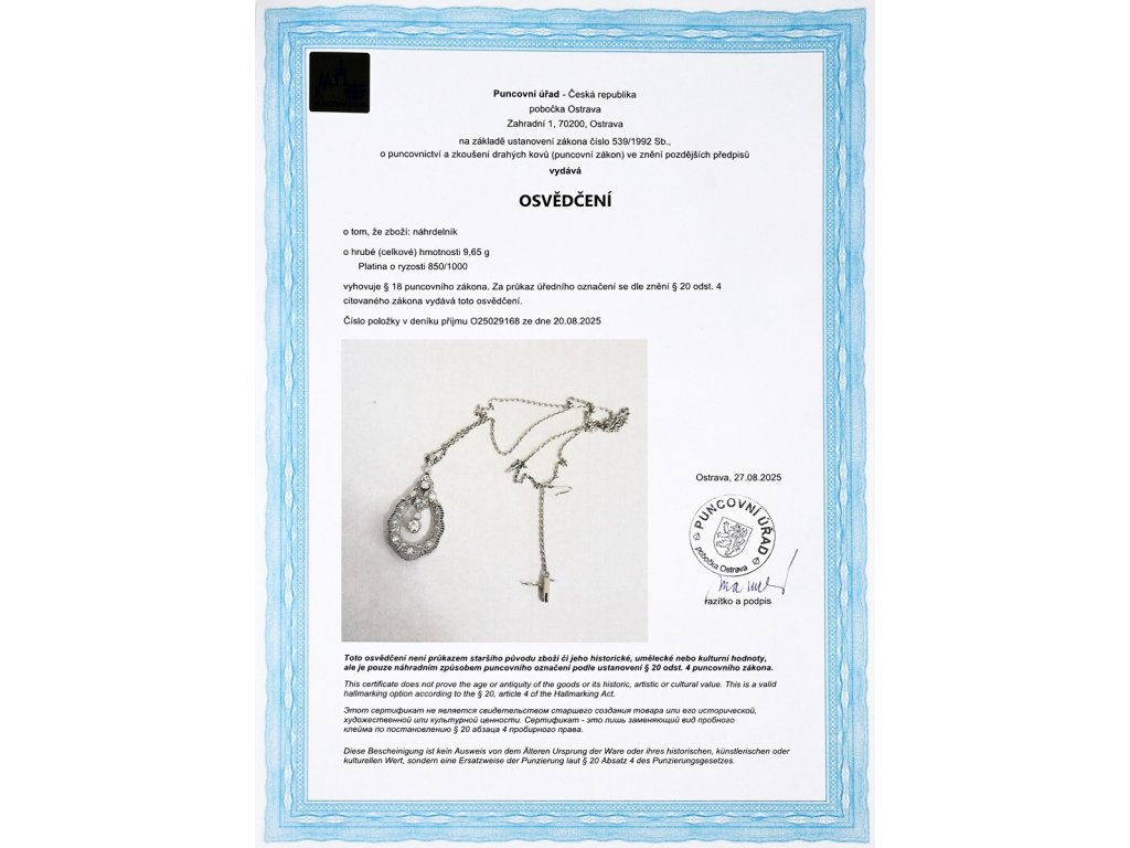 Materiál: platina o ryzosti 850/1000Hmotnost: 9,65 gRozměry: výška přívěsku 3,9 cm, délka řetízku 45 cm