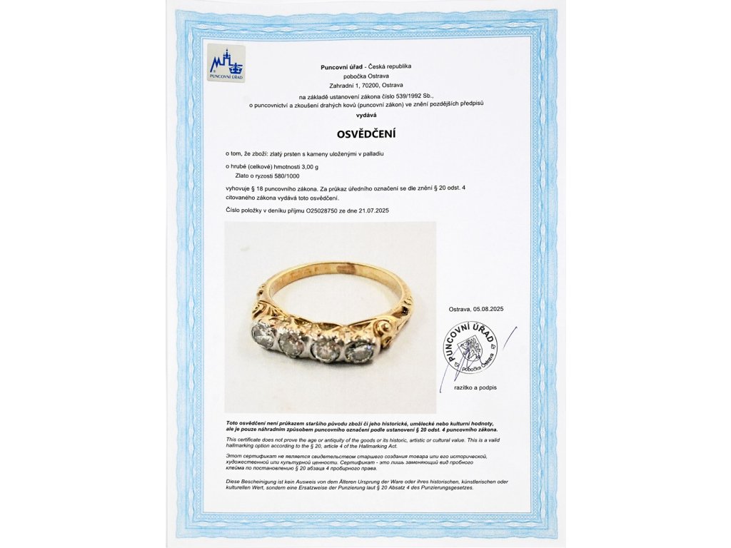 - osvědčení Puncovního úřadu České republiky