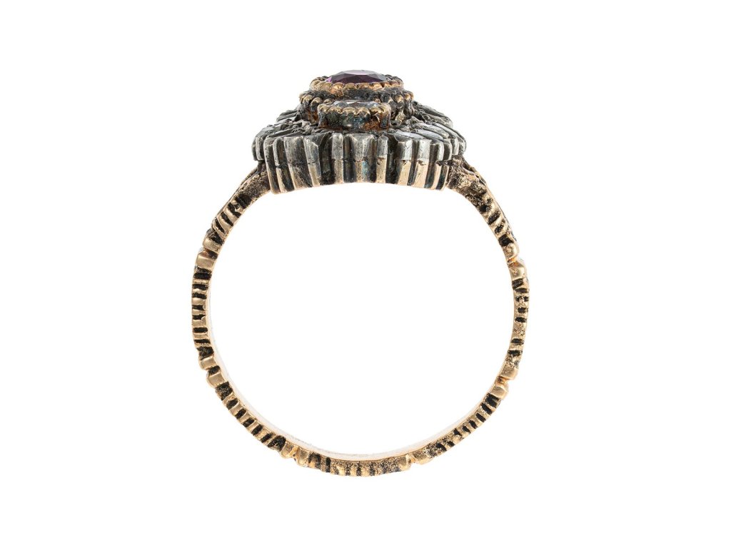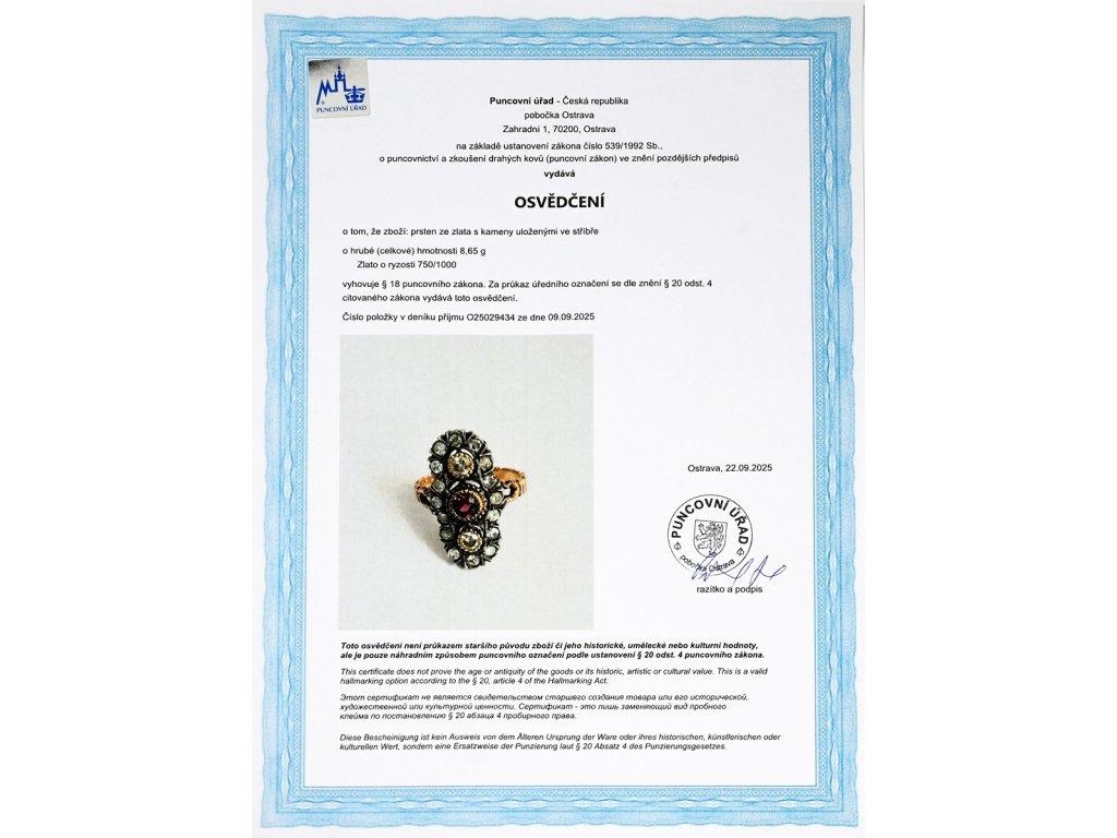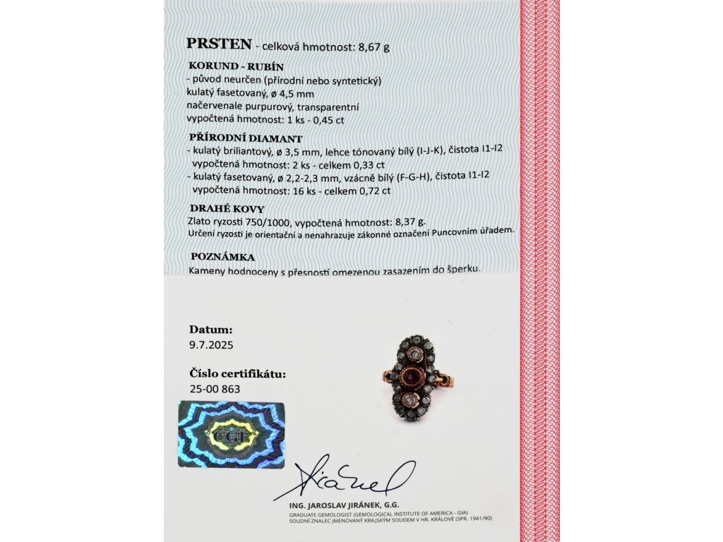 Zlato o ryzosti 750/1000váha 8,65 gpůvod neurčen (přírodní nebo syntetický) rubín 1 ks 0,45 ct, načervenale purpurovýpřírodní diamant 2 ks 0,33 ct, lehce tónovaný bílý (I-J-K), čistota I1-S2přírodní diamant 16 ks 0,72 ct, vzácně bílý (F-G-H), čistota I1-S2 | velikost 56míry hlavy 2,5 x 1,3 cmvýborný stavosvědčení puncovního úřaducertifikát z gemologické laboratoře je součástí šperku