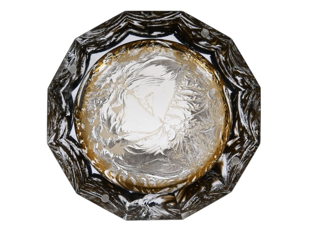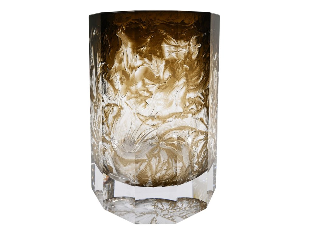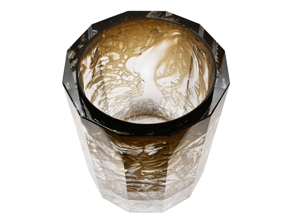 Materiál: těžké, kvalitně zpracované umělecké sklo Rozměry: výška 25 cm, šířka 18,5 cm Popis: broušené hrany, vnitřní stěny ledované Značení: nesignováno, autorská práce Stav: výborný
