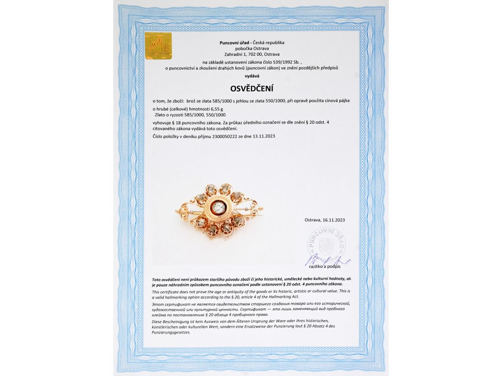 Zlato o ryzosti 580/ 1000váha 6,53 gr. 1900dobrý stavcentrální diamant 0,40 ctostatní diamantové routyvýška 2,6 cm, šířka 4 cmNabízíme kompletní zlatnický servis. Úpravy velikosti, opravy, rhodiování, výměnu kamenů, čištění, leštění, znalecké odhady a další služby dle vašich potřeb