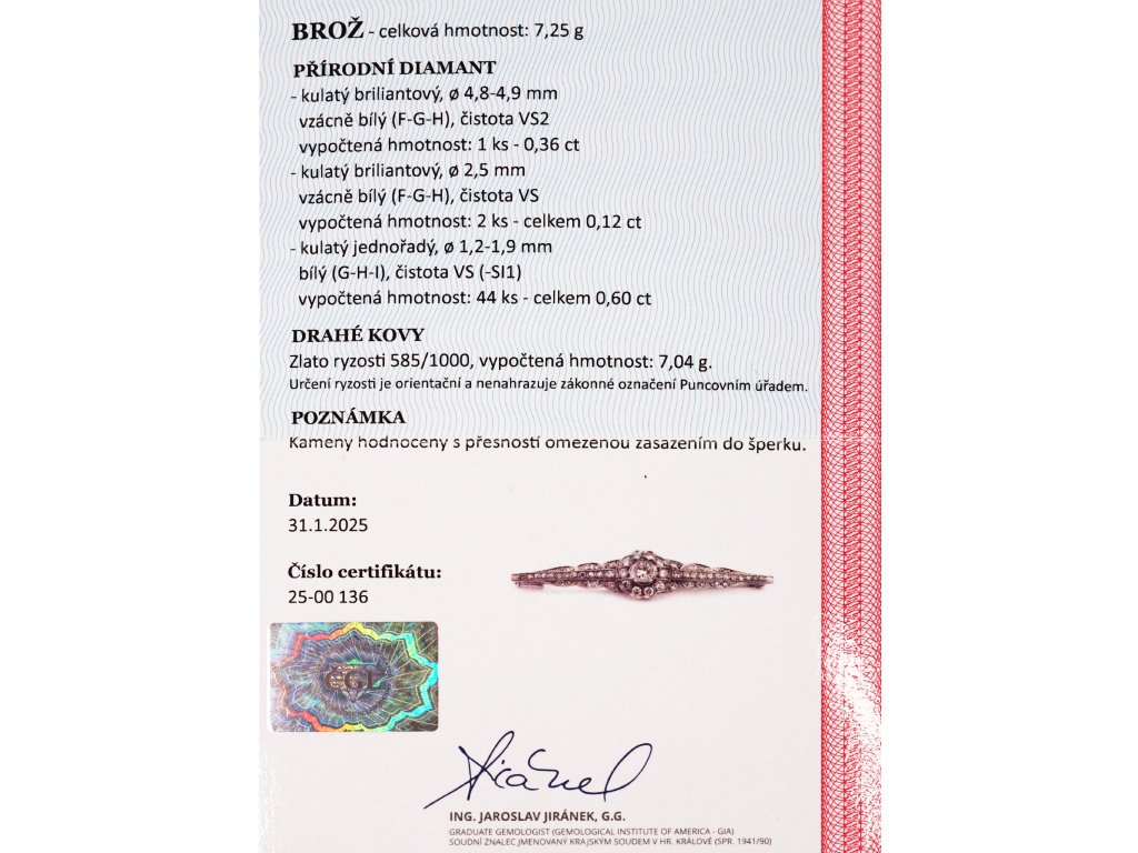 celková hmotnost 7,25 gpřírodní diamant 1 ks -0,36 ct, vzácně bílý (F-G-H), čistota VS2 ,kulatý briliant, ⌀ 4,8-4,9 mmpřírodní diamant 2 ks 0,12 ct ,vzácně bílý (F-G-H), čistota VSpřírodní diamant 44 ks 0,60 ct, vzácně bílý (G-H-I), čistota VS (-SI1)30. léta 20. stoletíprotáhlý geometrický tvardélka cca 6,5 cmosvědčení puncovního úřaducertifikát z gemologické laboratoře je součástí šperku
