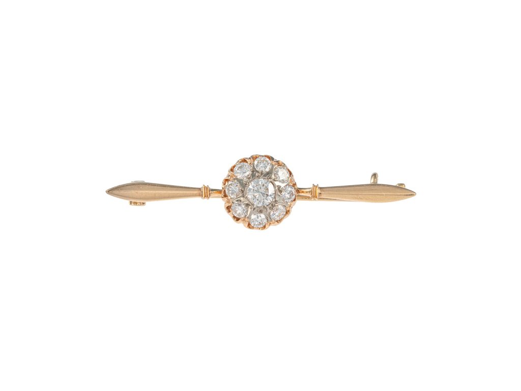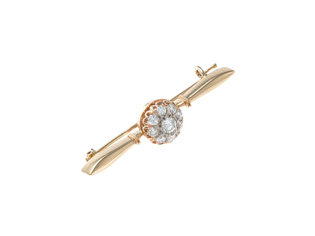 Materiál: žluté zlato o ryzosti 585/1000 Hmotnost: 5,35 g Rozměry: šířka 4,6 cm, průměr hlavy 1,1 cm