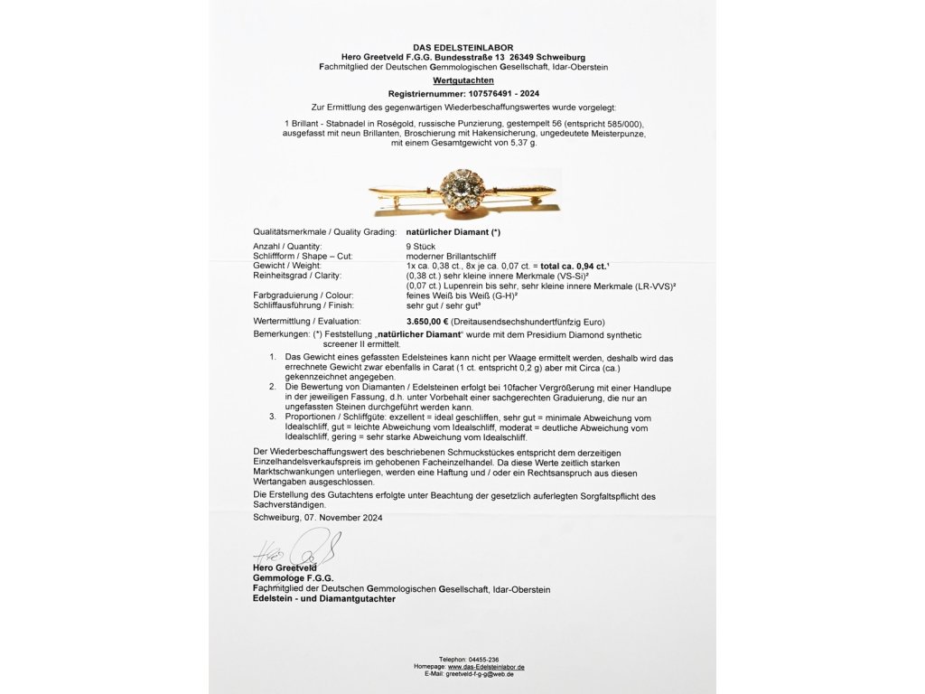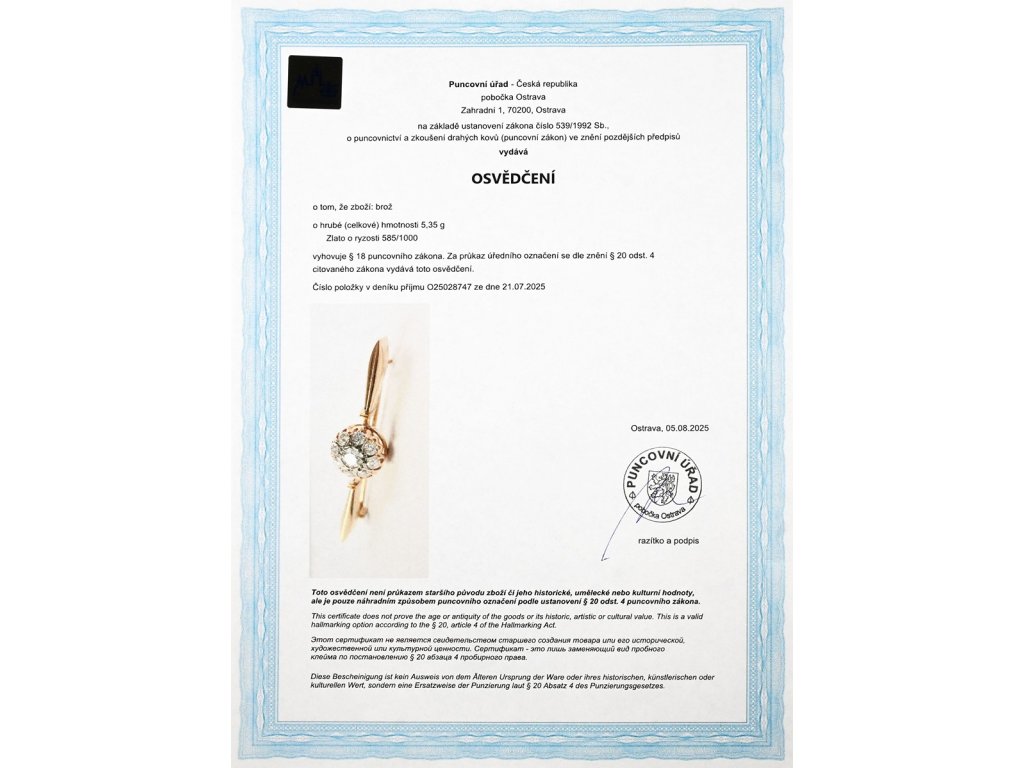 Doklady: • Osvědčení Puncovního úřadu České republiky • Certifikát z gemologické laboratoře je součástí šperku
