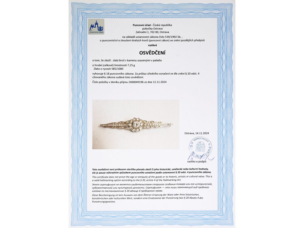 • 2 ks přírodních diamantů, celkem 0,12 ct, vzácně bílé (F–G–H), čistota VS,