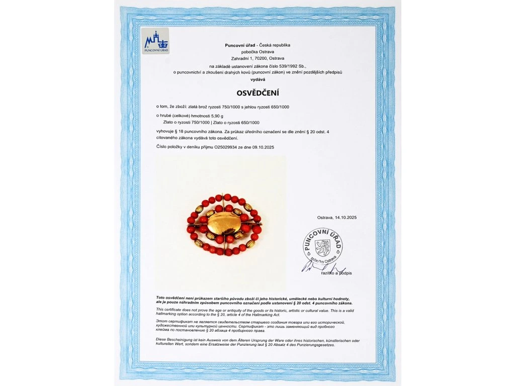 - osvědčení Puncovního úřadu České republiky