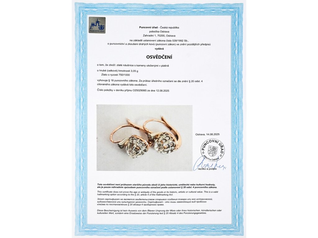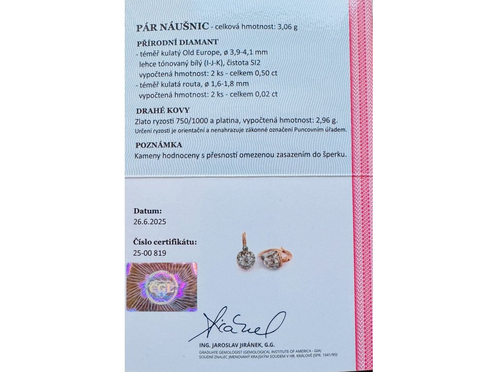 Zlato o ryzosti 750/1000platinaváha 3,05 gvýška s ouškem 1,3 cm, průměr hlavy 0,6 cmpřírodní diamanty 2 ks 0,50 ct, lehce tónovaný bílý (I-J-K), čistota SI2přírodní diamanty 2 ks 0,02 ct, kulatá routa, průměr 1,6-1,8 mmvýborný stavosvědčení puncovního úřaducertifikát z gemologické laboratoře je součástí šperkuNabízíme kompletní zlatnický servis na nejvyšší úrovni – od úprav velikostí a odborných oprav přes rhodiování, čištění, leštění až po výměnu kamenů a znalecké posudky. Vše přizpůsobíme vašim přáním.