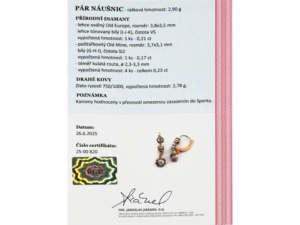 Zlato o ryzosti 750/1000váha 2,90 gvýška s ouškem 2,5 cm, průměr spodní hlavy 0,6 cmpřírodní diamant Old Europe 1 ks 0,21 ct, barva (I-J-K), čistota VSpolštářkovitý Old Mine 1 ks 0,17 ct, barva (G-H-I), čistota SI2routy 4 ks 0,23 ct výborný stavpuncováno platným puncemcertifikát z gemologické laboratoře je součástí šperkuNabízíme kompletní zlatnický servis na nejvyšší úrovni – od úprav velikostí a odborných oprav přes rhodiování, čištění, leštění až po výměnu kamenů a znalecké posudky. Vše přizpůsobíme vašim přáním.
