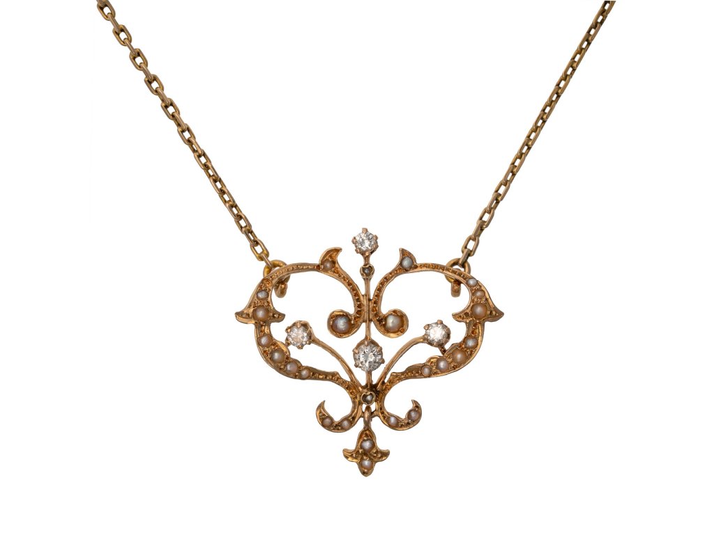 zlato o ryzosti 750/1000, 585/1000váha 7,05 gvýška přívěsku 2,7 cm, šířka 2,9 cmdélka řetízku 45 cmnáhrdelník 750/1000pérový kroužek 585/1000zapínací kroužek s obecného kovuvýborný stavosvědčení puncovního úřadu
