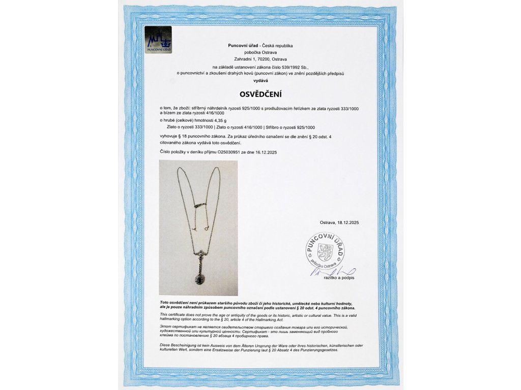 - osvědčení Puncovního úřadu České republiky