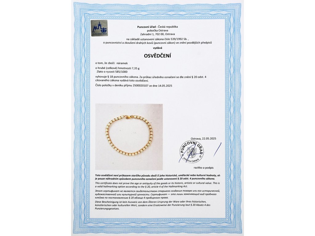 Zlato o ryzosti 585/1000váha 7,35 gdélka 18 cm, šířka 0,3 cmsyntetické opály 39 ks 3,9 ctvýborný stavosvědčení puncovního úřadu kameny s garancí pravosti zkontrolované v gemologické laboratoři