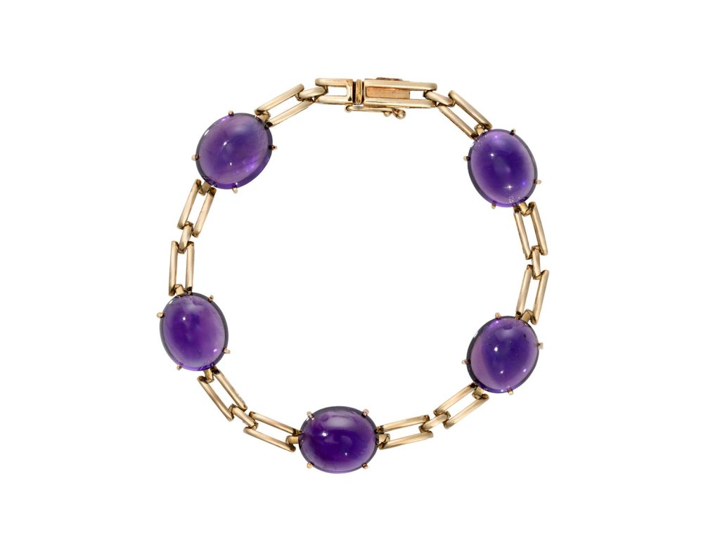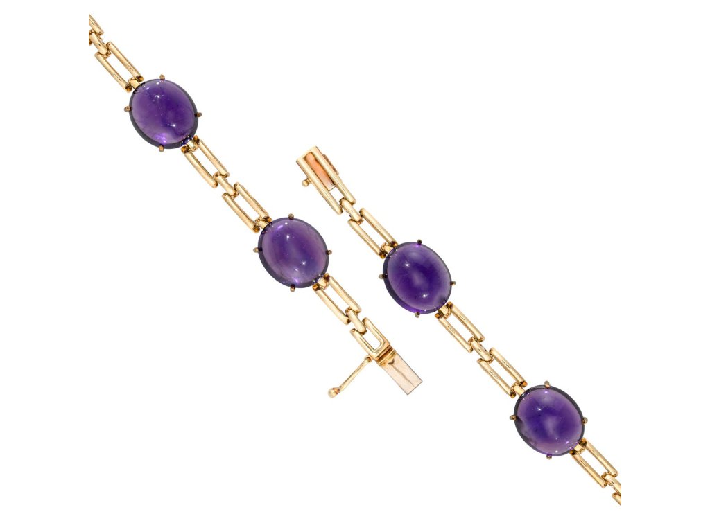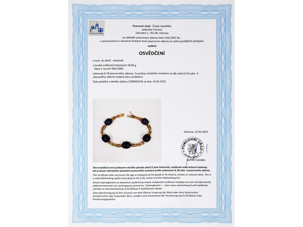 Zlato o ryzosti 585/1000váha 18,85 gdélka 18,5 cm, šířka 1 cmametystvýborný stavkameny zkontrolovány v gemologické laboratořiosvědčení puncovního úřadu