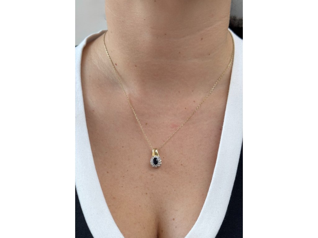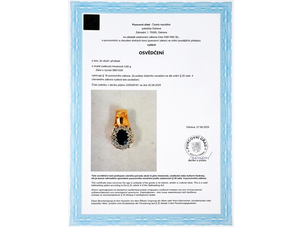 žluté zlato o ryzosti 585/1000váha 3,80 gvýška 1,8 cm, šířka 1 cmpřírodní safír cca 1 ctpřírodní diamanty cca 0,24 ctvýborný stavkameny s garancí pravosti zkontrolované v gemologické laboratořiosvědčení puncovního úřadu | řetízek není součásti aukce