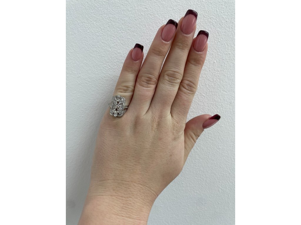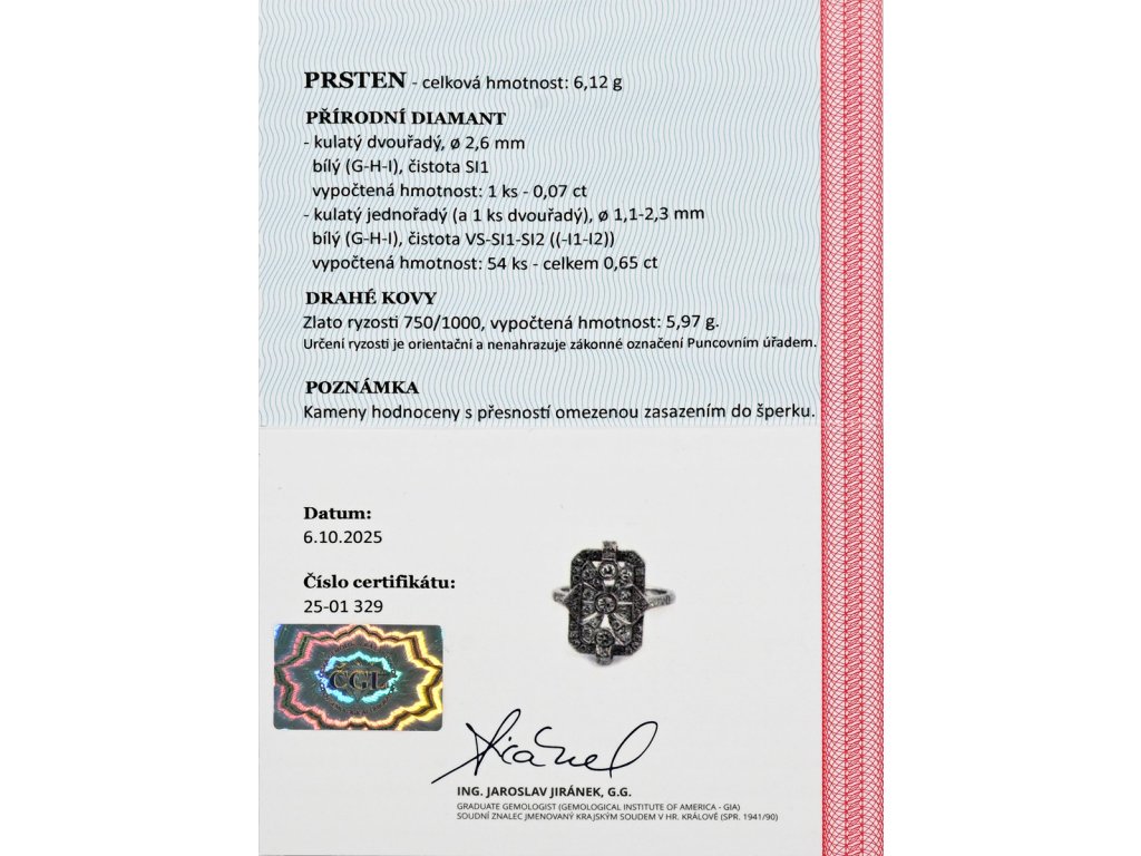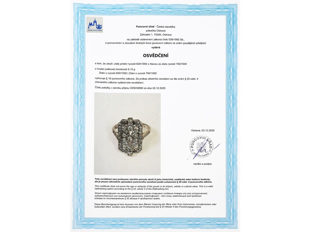 Materiál: bílé zlato o ryzosti 620, 750/1000Hmotnost: 6,15 gRozměry: velikost prstenu 53, míry hlavy 1,9x1,2 cm