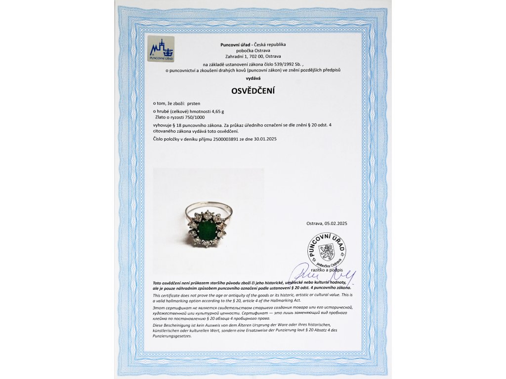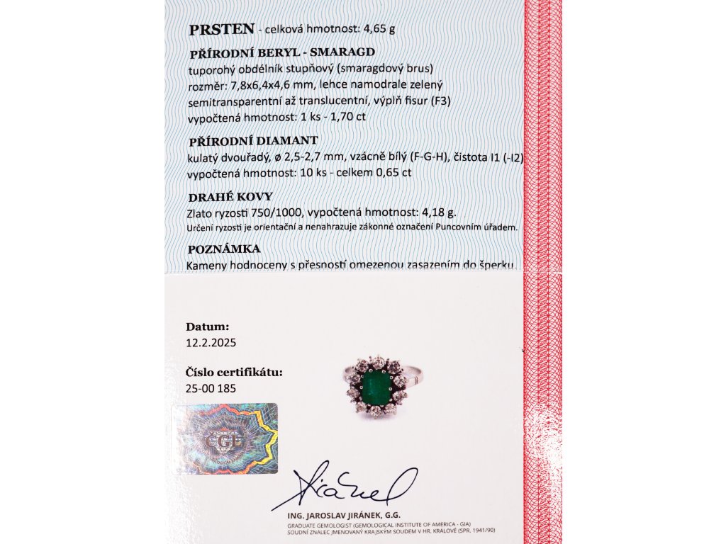 zlato o ryzosti 750/ 1000celková hmotnost 4,65 gr. 1970, dobrý stavpřírodní smaragd 1ks 1,70 ct, rozměr 7,8x6,4x4x,6 mmpřírodní diamant 10 ks 0,,65 ct, vzácně bílý (F-G-H), čistota I1 (I2)velikost hlavy prstenu 1,4 x 1,5 cmvelikost prstenu 57osvědčení puncovního úřaducertifikát z gemologické laboratoře je součástí šperku