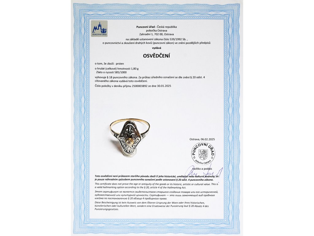 Zlato 585/1000váha 1,79 gvelikost hlavy prstenu 1,5×1 cmvelikost prstenu 51r. 1930, dobrý stavosvědčení puncovního úřadu
