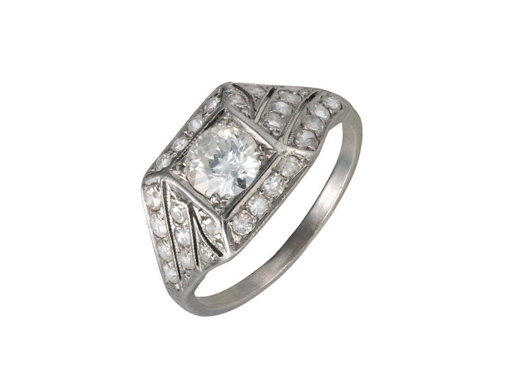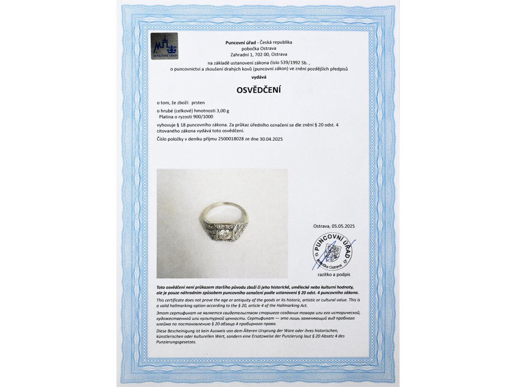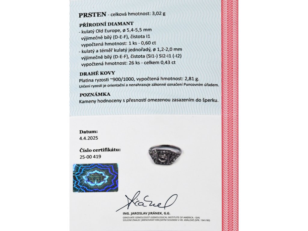 přírodní diamant 1 ks 0,60 ct, vzácně bílý (D-E-F), čistota I1, diamanty 26 ks 0,43 ct, vzácně bílý (D-E-F), čistota SI1-SI2-I1-I2 velikost 51-52