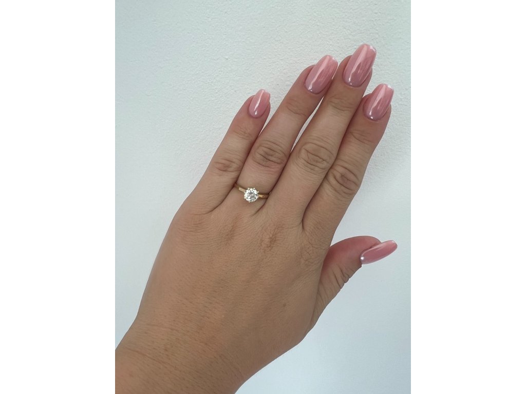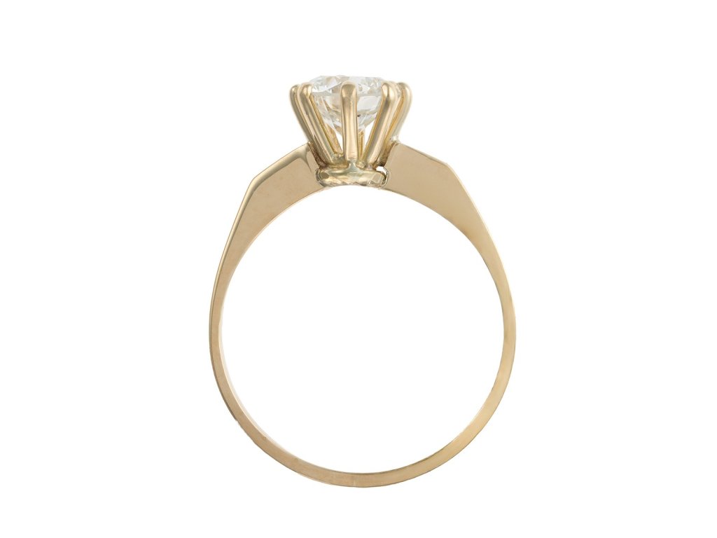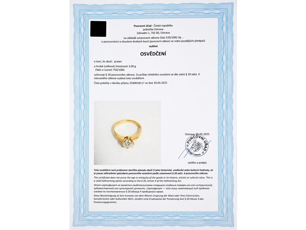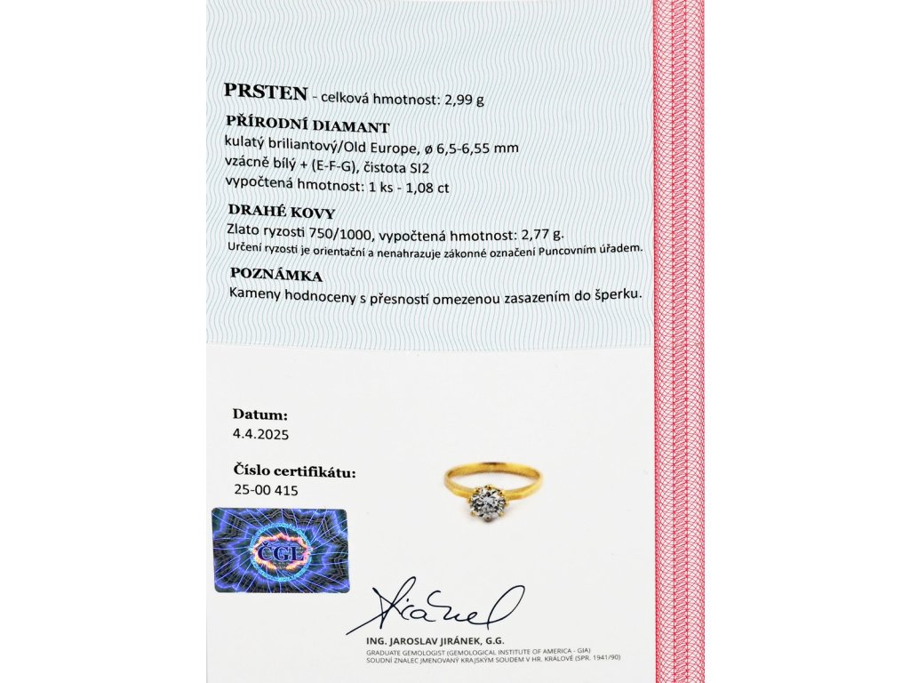 žluté zlato o ryzosti 750/1000váha 3,00 gpřírodní diamant Old Europe 1 ks 1,08 ct, vzácně bílý (E-F-G), čistota SI2velikost 54průměr hlavy 0,7 cmvýborný stavosvědčení puncovního úřaducertifikát z gemologické laboratoře je součástí šperku