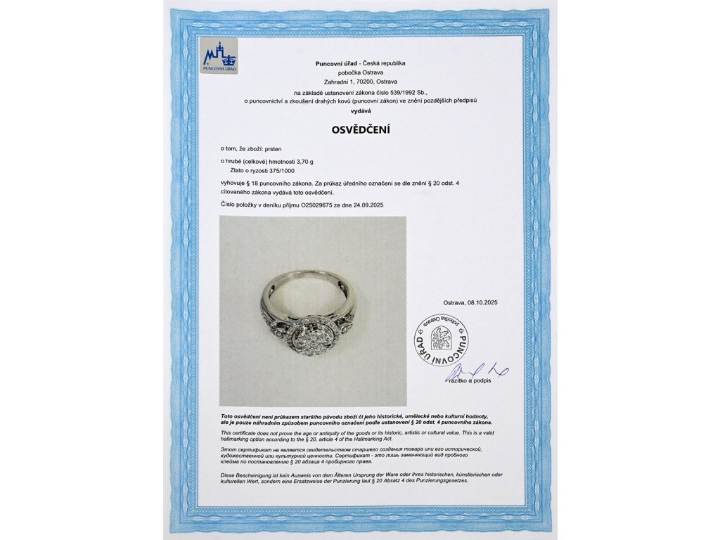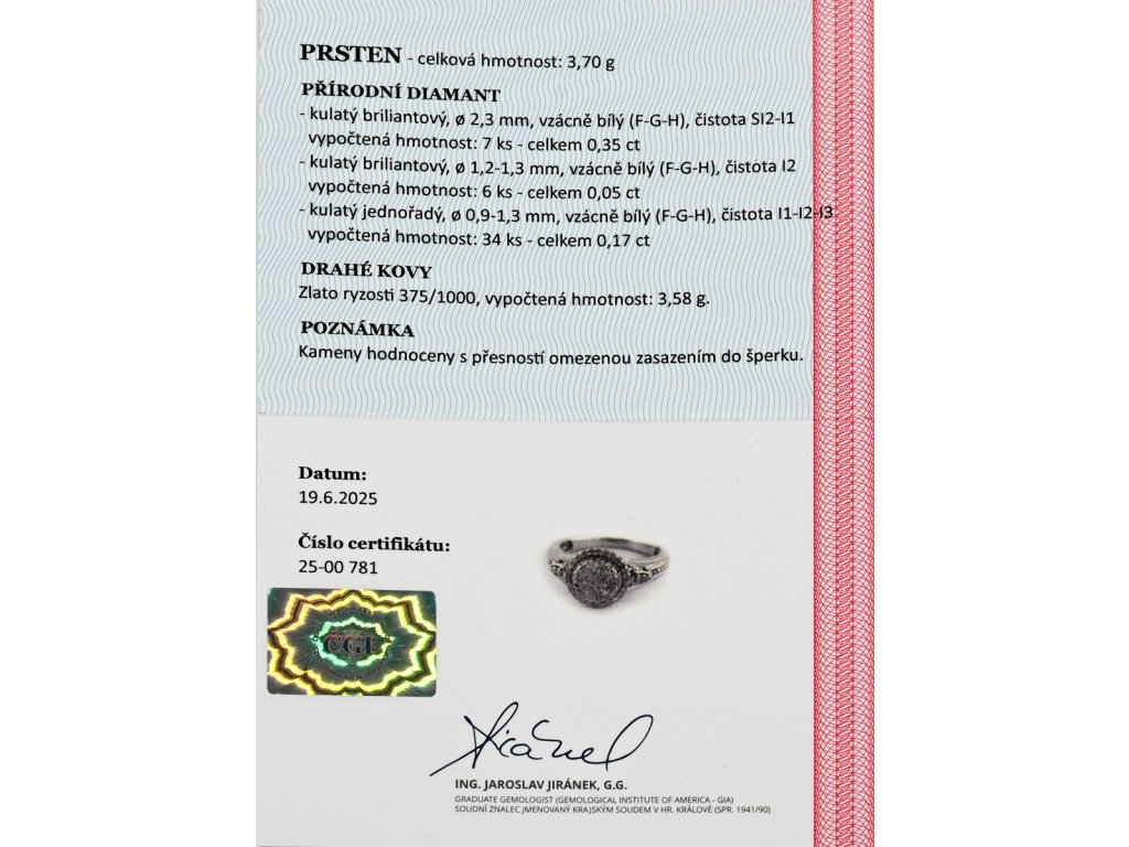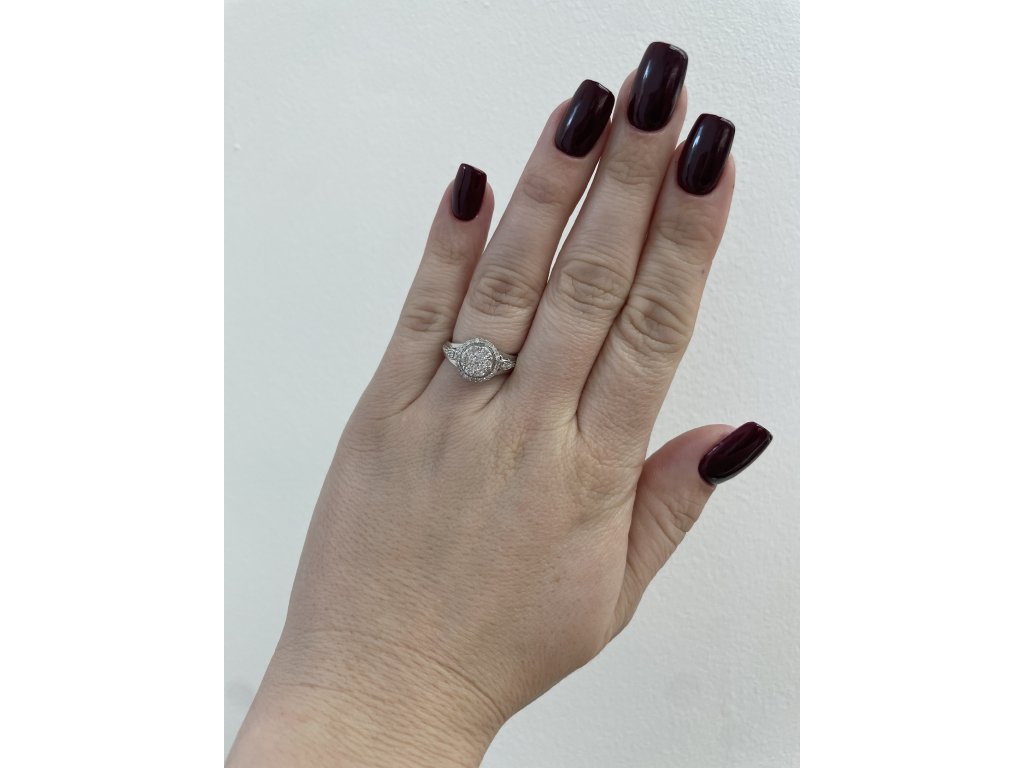Materiál: bílé zlato o ryzosti 375/1000Hmotnost: 3,70 gRozměry: velikost prstenu 52,5, průměr hlavy 1 cm
