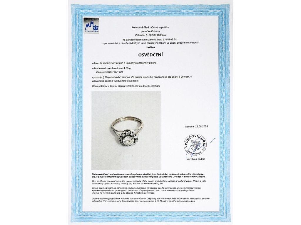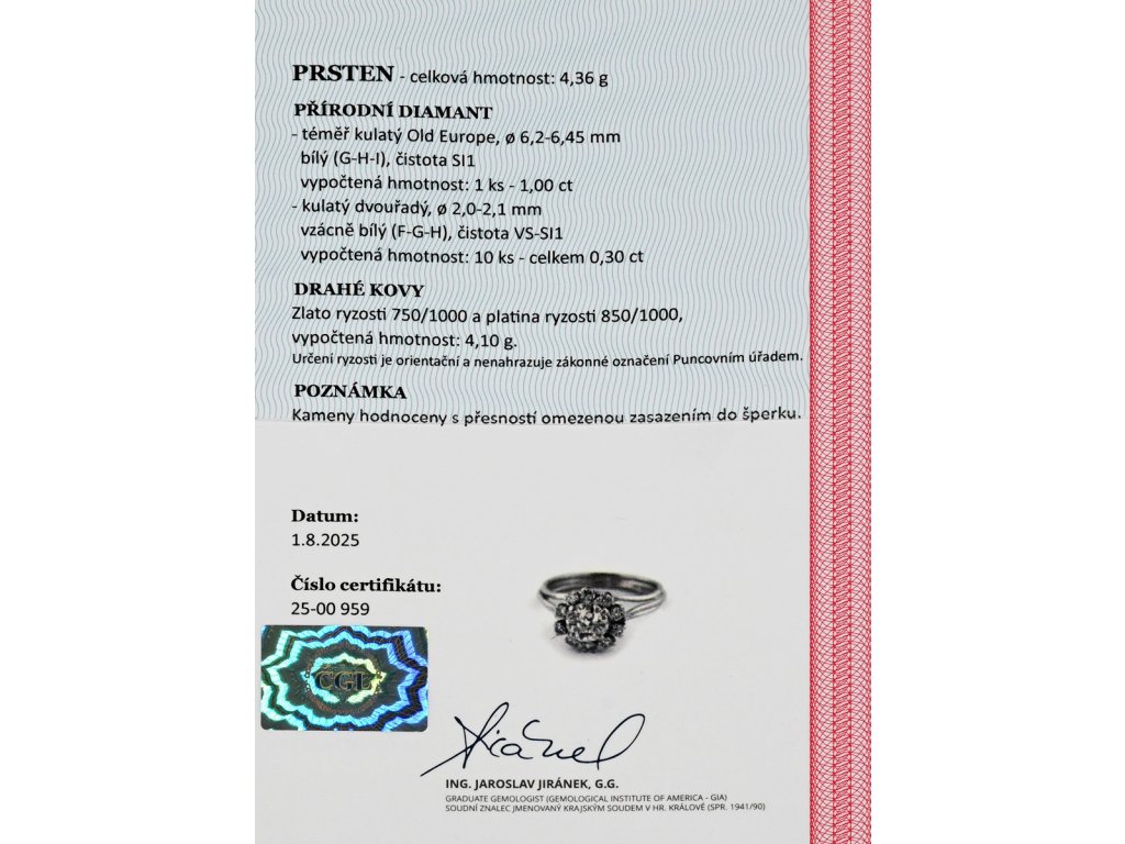 Zlato o ryzosti 750/1000váha 4,35 gpřírodní diamant Old Europe 1 ks 1,00 ct bílý (G-H-I), čistota SI1přírodní diamant 10 ks 0,30 ct, vzácně bílý (F-G-H), čistota VS-SI1velikost 51průměr hlavy 1 cmvýborný stavosvědčení puncovního úřaducertifikát z gemologické laboratoře je součástí šperkuNabízíme kompletní zlatnický servis na nejvyšší úrovni – od úprav velikostí a odborných oprav přes rhodiování, čištění, leštění až po výměnu kamenů a znalecké posudky. Vše přizpůsobíme vašim přáním.
