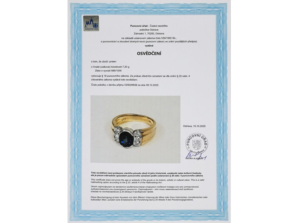Materiál: žluté zlato o ryzosti 585/1000Hmotnost: 7,20 gRozměry: velikost 50,5, míry hlavy 0,9x1,2 cm