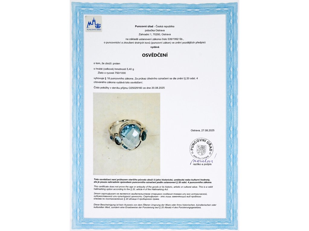 Drahokamy: • Přírodní diamanty, celkem 0,10 ct • Topaz 8,1 ct