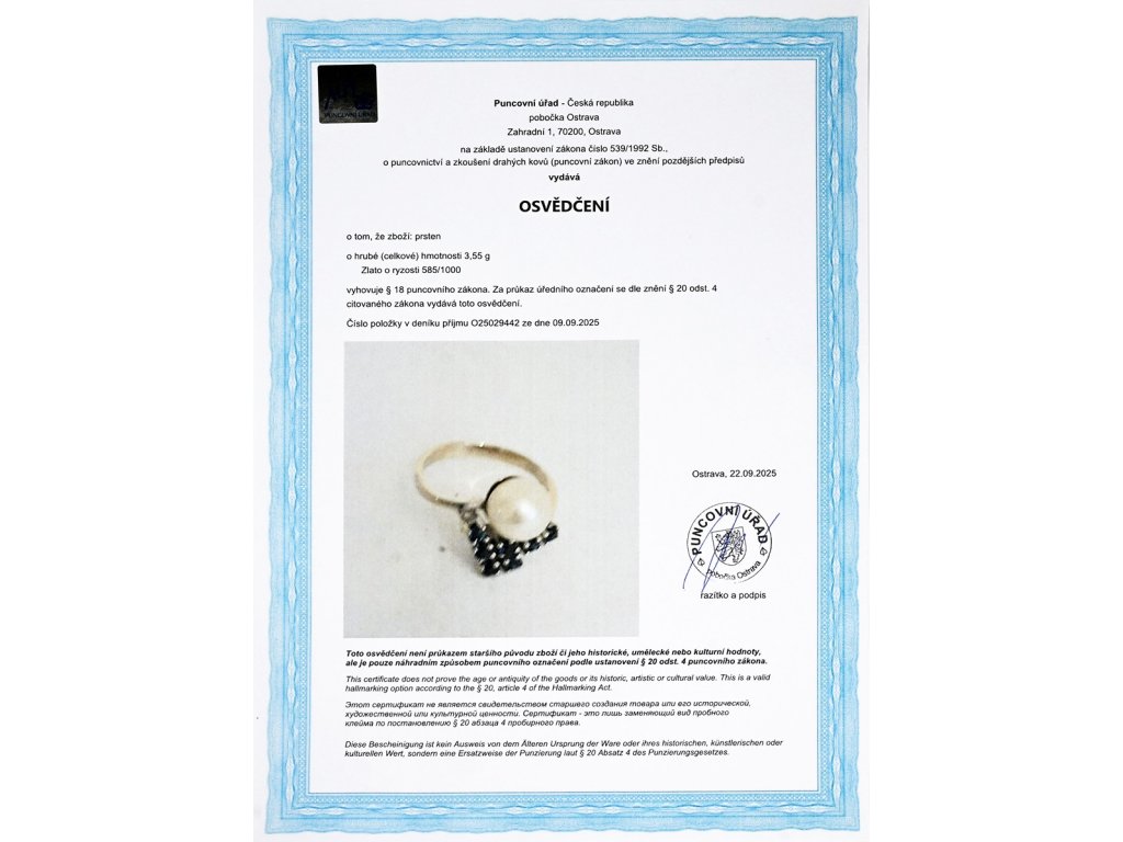 Zlato o ryzosti 585/1000váha 3,55 gpřírodní safíry 7 ks 0,35 ctvelikost 50výborný stavosvědčení puncovního úřadukameny s garancí pravosti zkontrolované v gemologické laboratoři