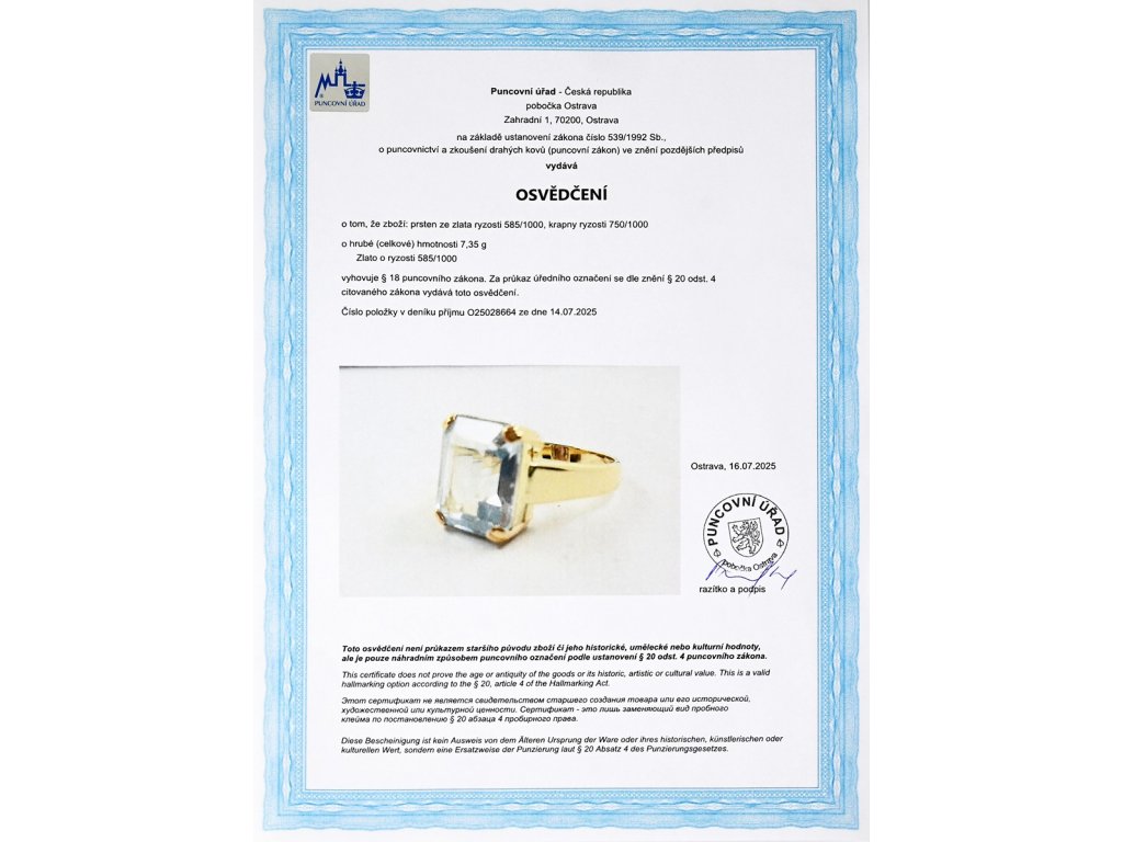 Zlato o ryzosti 585/1000krapny o ryzosti 750/1000váha 7,35 gsyntetický spinelvelikost 54míry kamene 1,3 x 1,1 cmvýborný stavosvědčení puncovního úřadukameny zkontrolovány v gemologické laboratoři