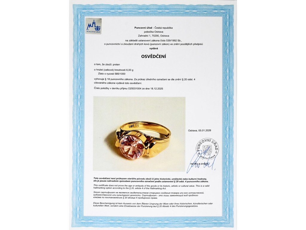 - osvědčení Puncovního úřadu České republiky
