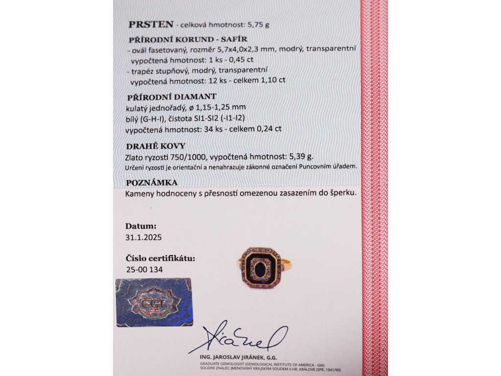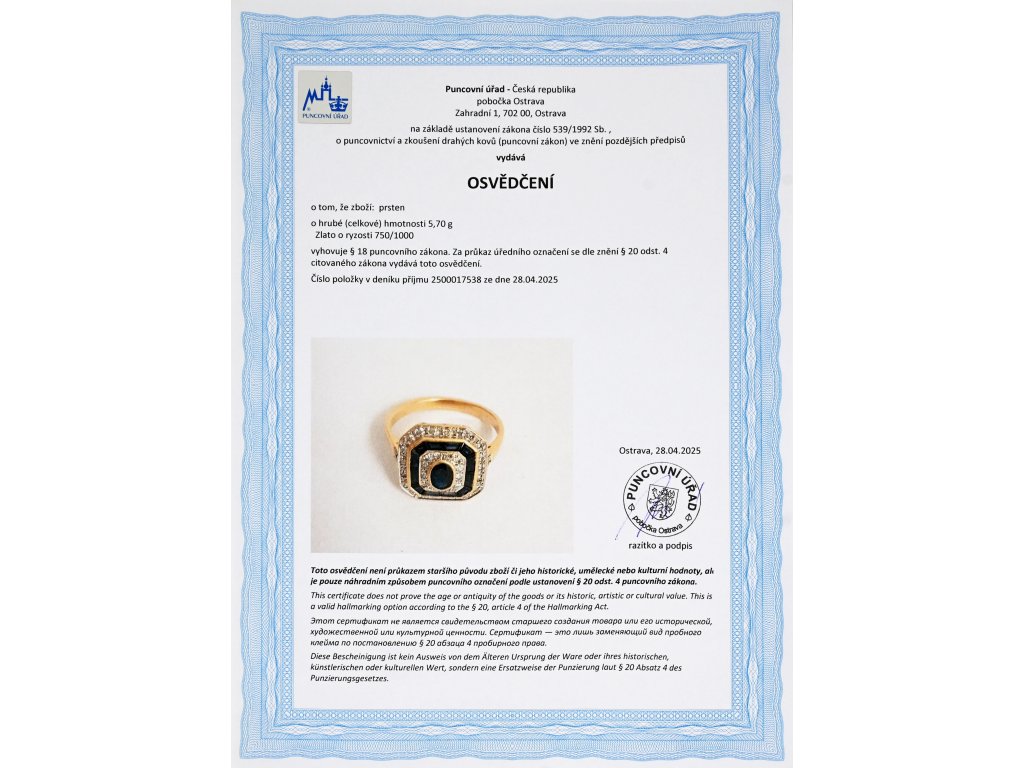 Materiál: žluté zlato o ryzosti 750/1000Hmotnost: 5,70 gRozměry: velikost prstenu 63,5, míry hlavy 1,6x1,5 cm